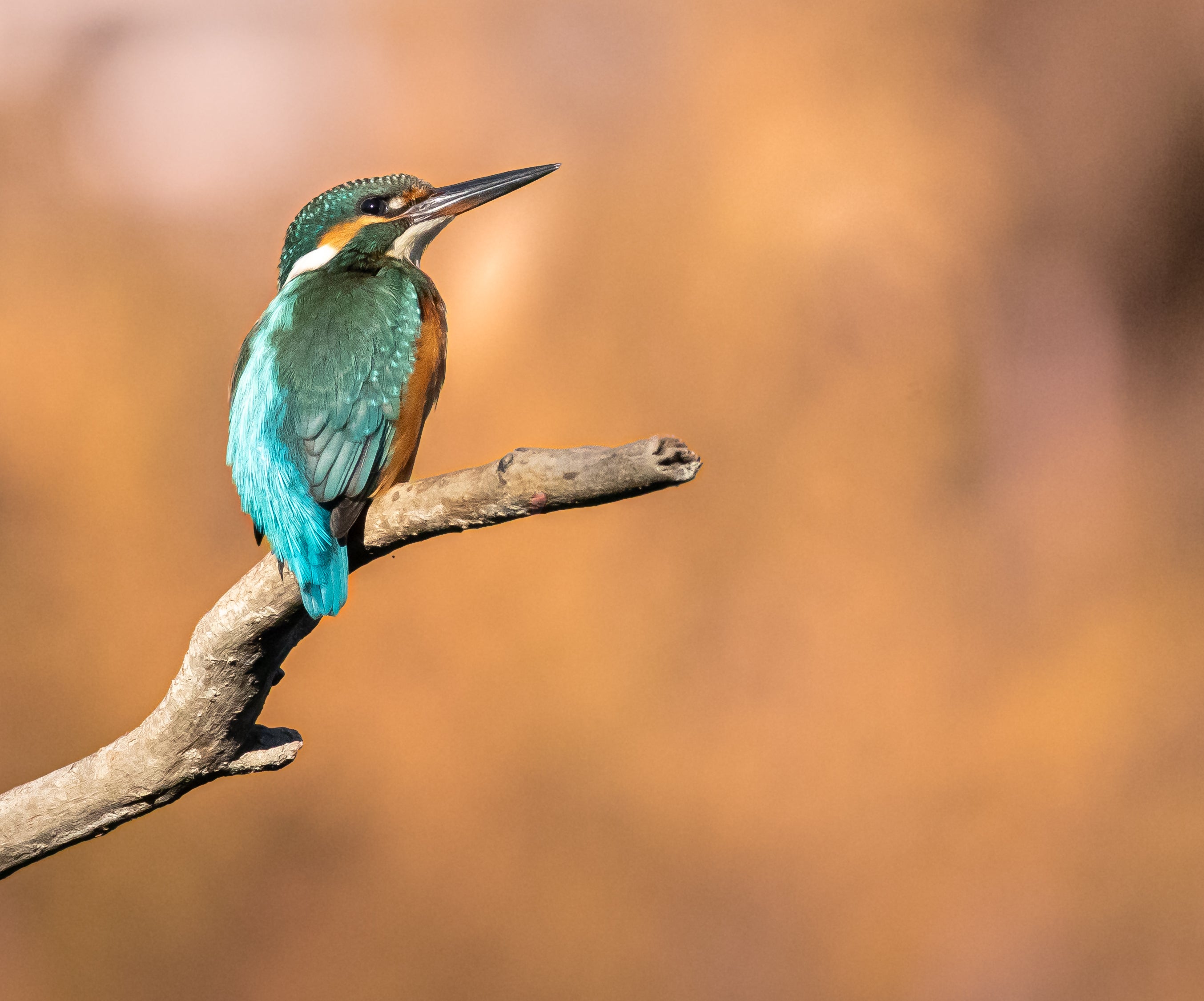 This photograph of a Common Kingfisher (Alcedo atthis) highlights its vibrant turquoise and orange plumage against a warm background. -